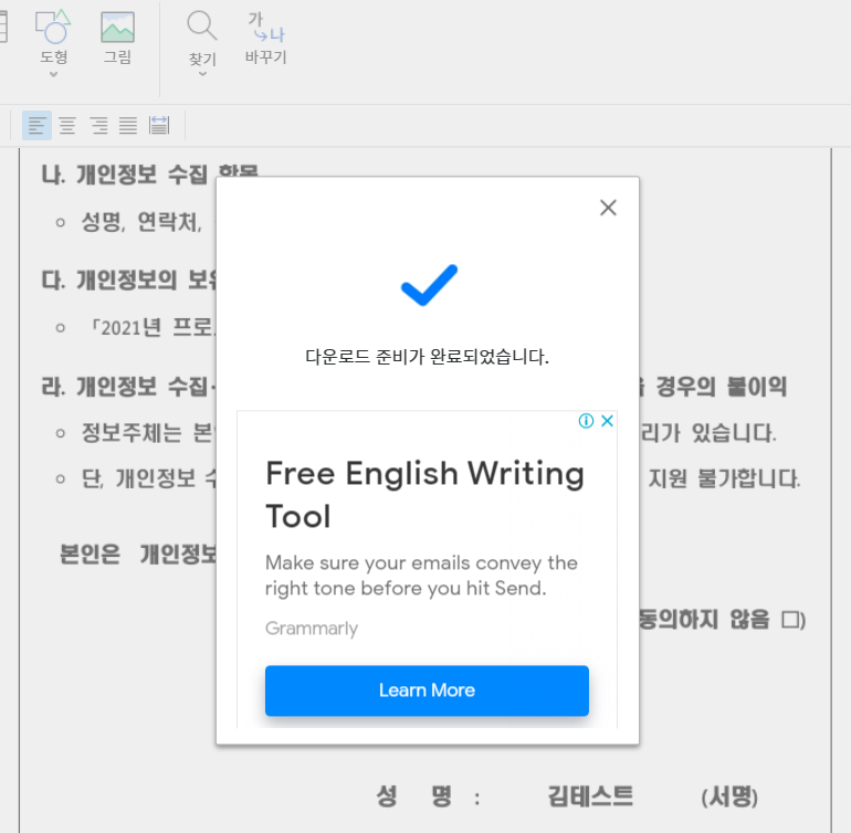 다운로드 클릭하면 '다운로드 준비가 완료되었습니다' 라는 팝업이 뜬다. 한글파일 수정/편집 후 저장까지 완료가 되었다.