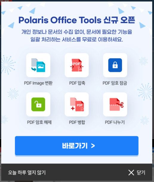 폴라리스 오피스 웹이 들어가니 '폴라리스 오피스 툴스' 신규 오픈 이라는 팝업이 뜬다. 평소 PDF 파일을 이미지로 변환하기 위해서 캡쳐프로그램을 이용해 작업을 했었는데 마침 신규툴에 PDF image 변환의 기능이 있어서 반가웠다.