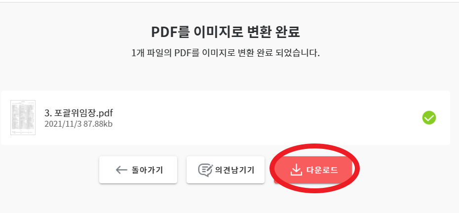 이미지로 변환이 완료 되었다. 저장을 하려면 빨간색으로 체크해둔 '다운로드'를 클릭해야 내 PC에 저장이 된다.