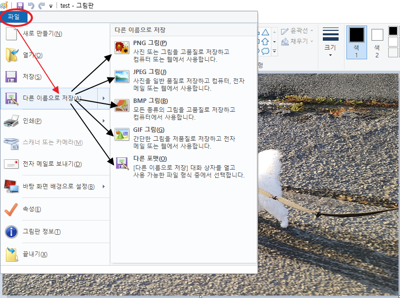 '파일' -> '다른 이름으로 저장' 순서로 클릭하면 된다. 이때 확장자라고해서 파일 형식을 선택할 수 있게 되어있는데 사진 용량을 작게하고 싶으면 JPEG, GIF 을 선택하면 되고 용량이 커도 상관없이 고품질로 저장하려고 한다면 PNG, BMP 로 선택하면 되겠다. 이후 변경 원하는 파일명으로 수정하여 저장할 수가 있다.