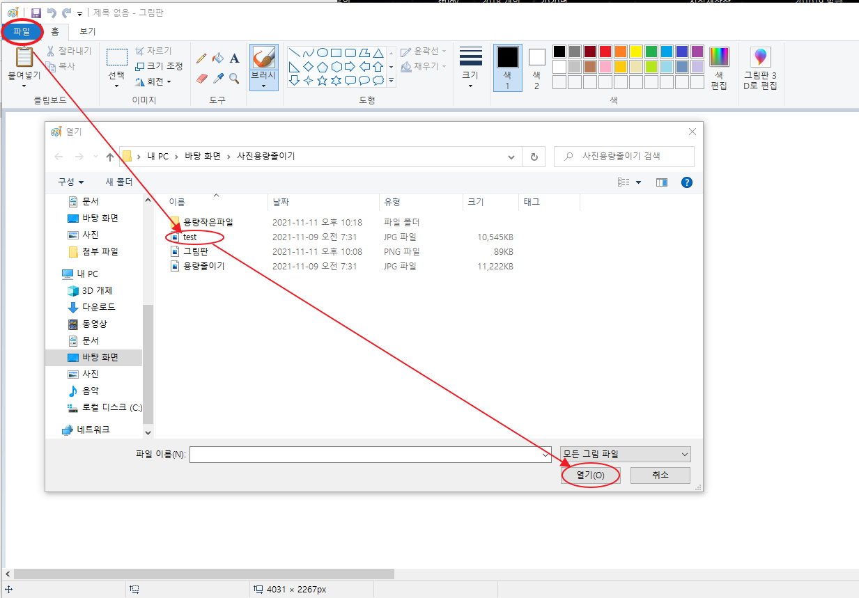 그림판이 실행되었다면 용량을 줄이고 편집할 사진파일을 불러오는 단계이다. 사진파일을 그림판으로 드래그(끌어오기)로 가져와도 되고, 경로명을 알고 있다면 위 사진과 같이 파일 - 파일위치(경로) - 열기 순서로 클릭해가며 불러온다.