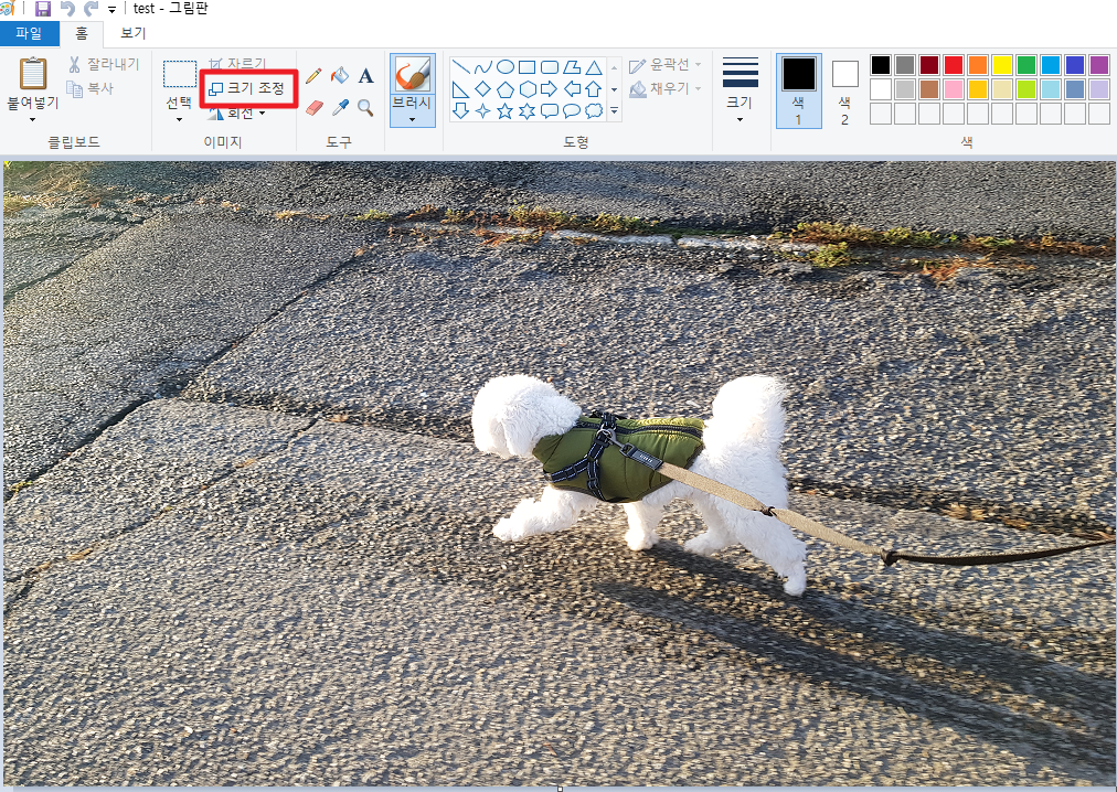 편집할 사진을 잘 불러 왔다면 화면에 해당 사진이 보일 것이다. 잘 불러 와 졌다면 상단에 있는 '크기 조정' 이라는 곳을 클릭한다. (크기 조정을 찾을 수 없다면 '홈' -> '크기 조정' 을 찾으면 된다)