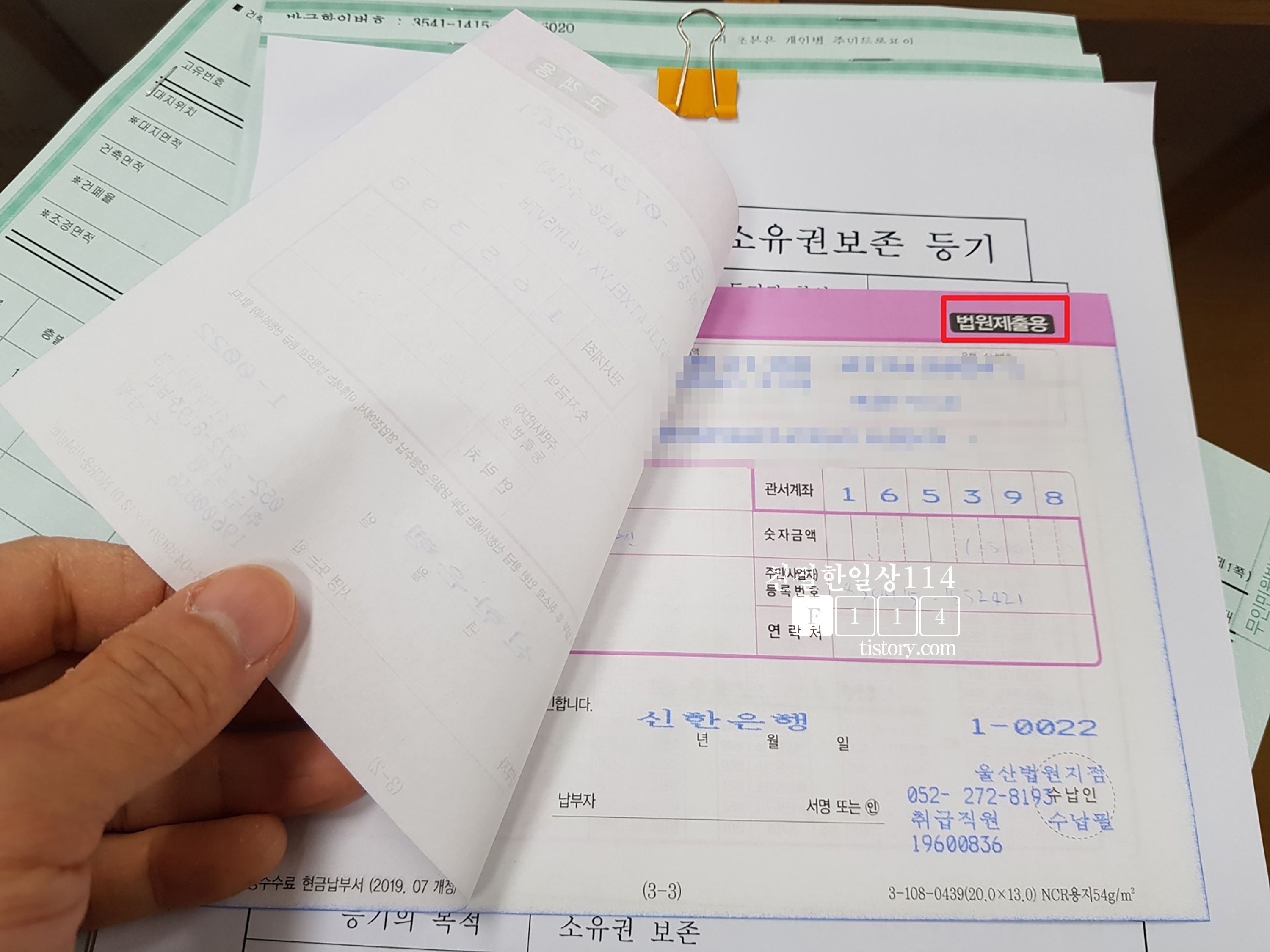 납부영수증은 2장으로 하나는 고객용 또 하나는 법원제출용이 있다. 이 '법원제출용'을 소유권보존 등기 신청서에 붙힌다.
