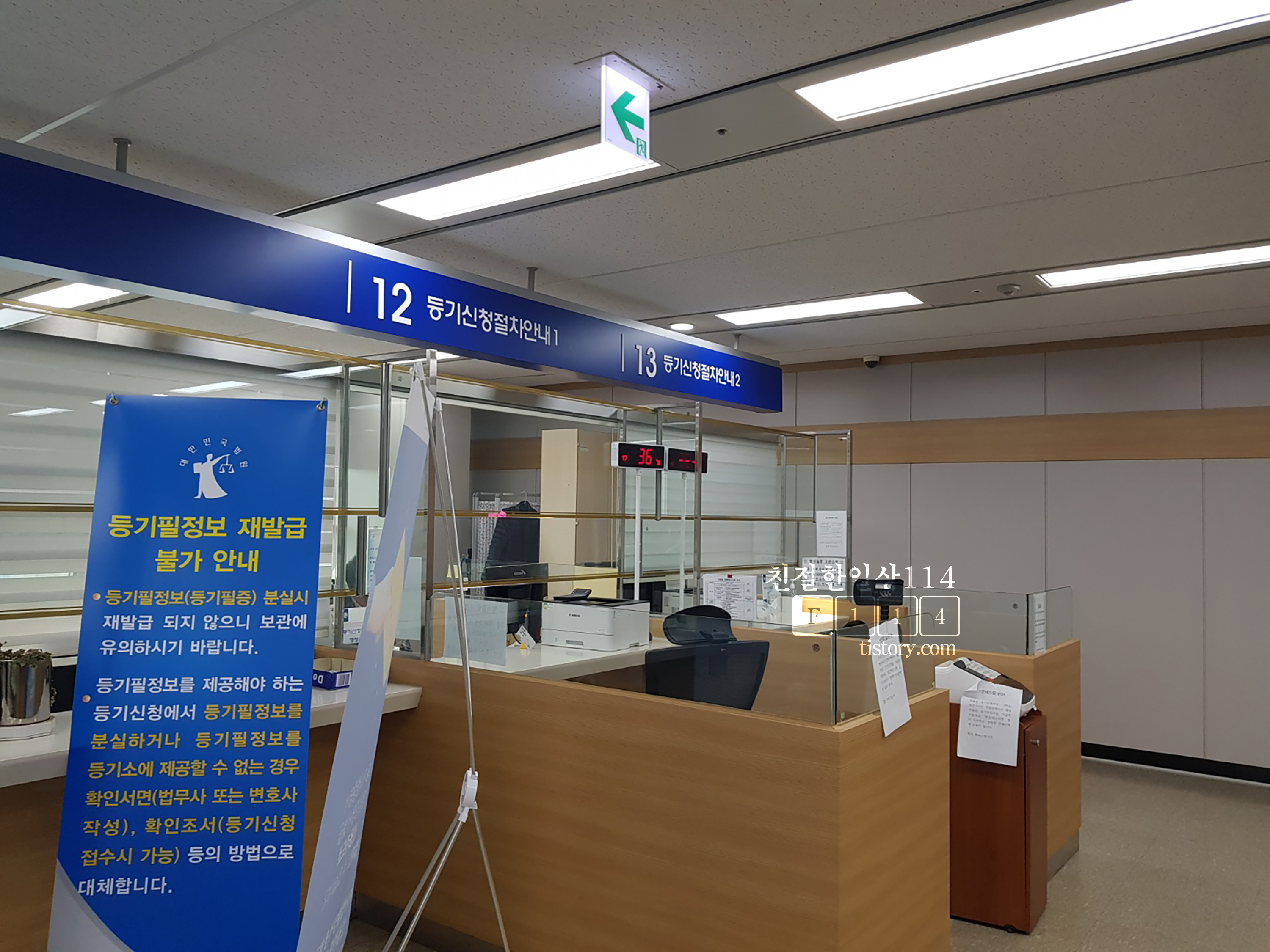 등기접수하는 등기소의 위치는 울산지방법원 2층 등기과에 있다. 등기과 안내간판을 찾을 수가 없어서 법원 건물로 들어가서 직원에게 물어 2층으로 올라간다. 등기과로 들어가 가장 안쪽으로 '12번 등기신청절차안내' 쪽으로가서 번호표를 받고 등기접수하러 왔다고 말하니 준비해 온 서류를 달라고 해서 보여준다.
