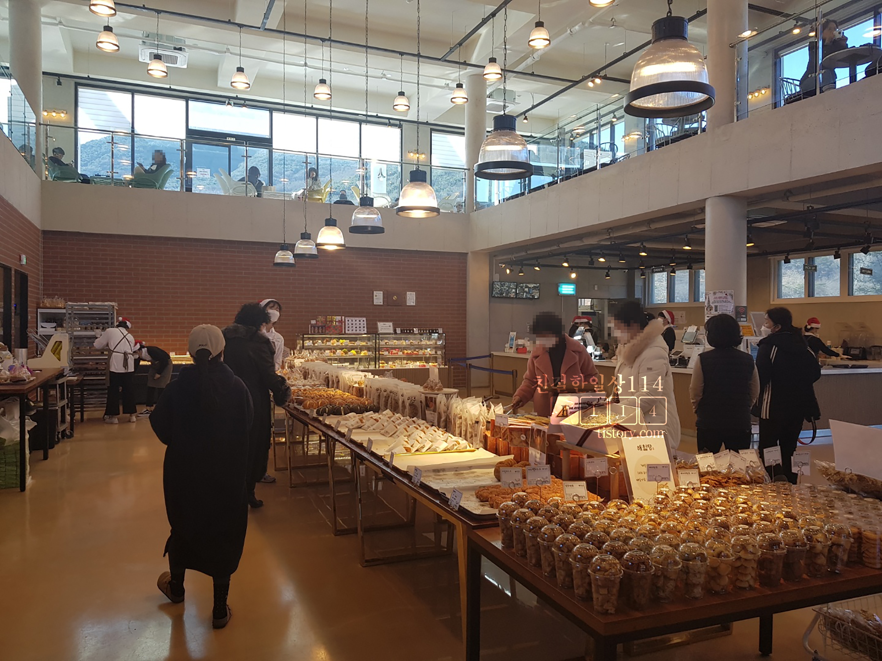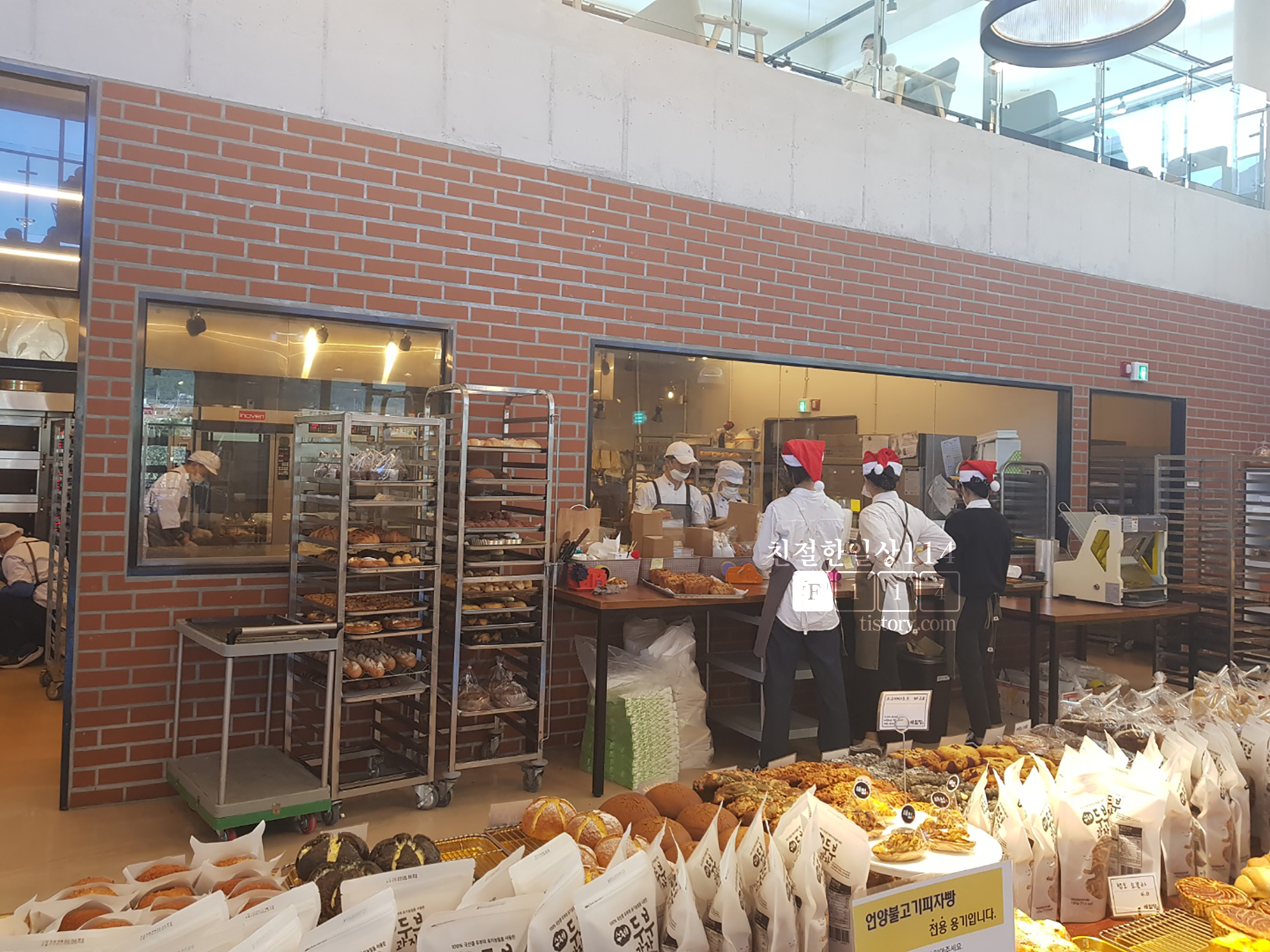 1층 좌측편에서 계속해서 빵을 만들고 굽고 있다. 크리스마스가 다가오고 있어 직원들이 빨간 산타모자를 쓰고 일하고 있다.