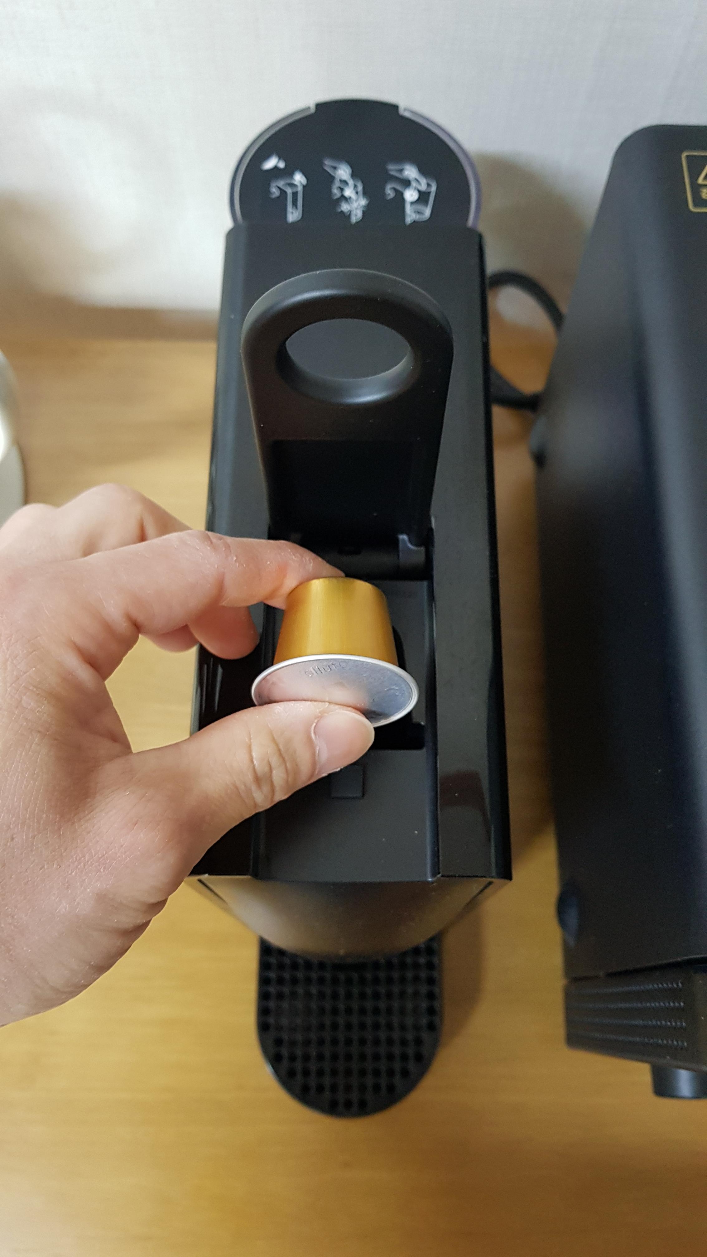캡슐 모양대로 방향을 맞춰서 넣는다. 딸깍 소리같은건 나지 않으며 그냥 떨어뜨린다는 느낌으로 넣으면 된다.