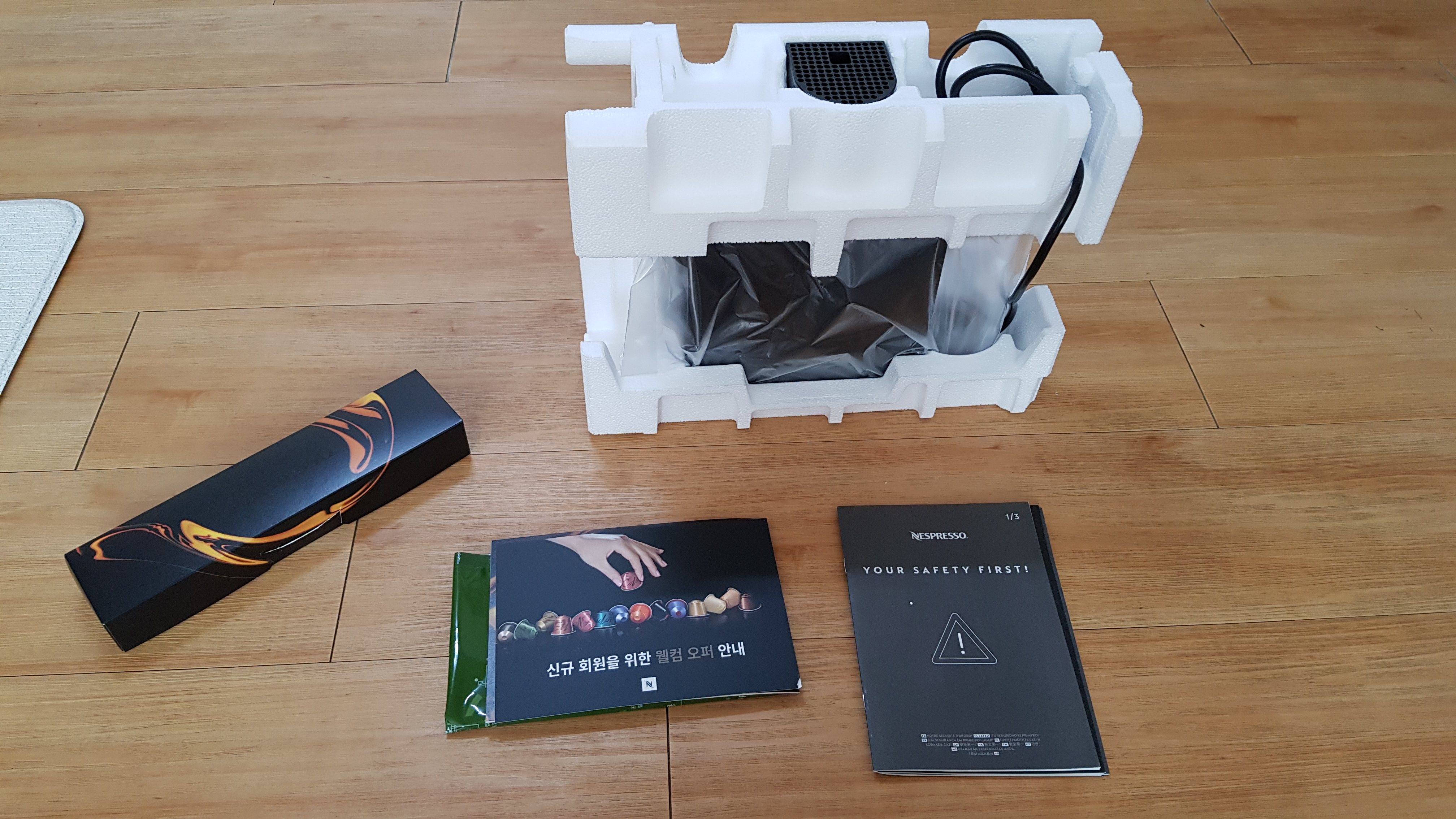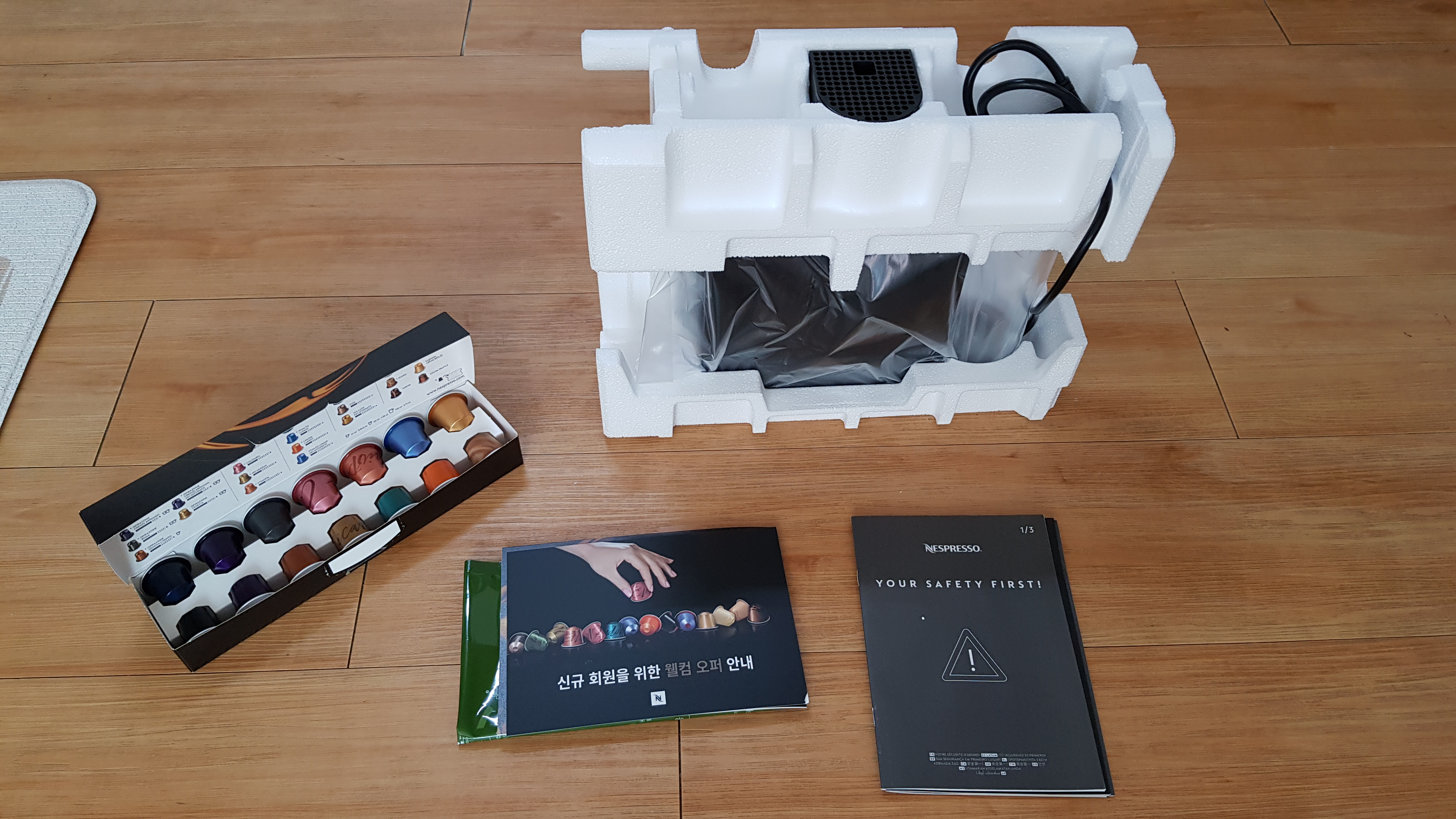 열어보면 스티로폼으로 단단히 고정되게 포장되어 안전하게 받아볼 수 있다. 머신 본체와 설명서 맛보기용 캡슐14팩, 재활용백 이렇게 구성되어있다.