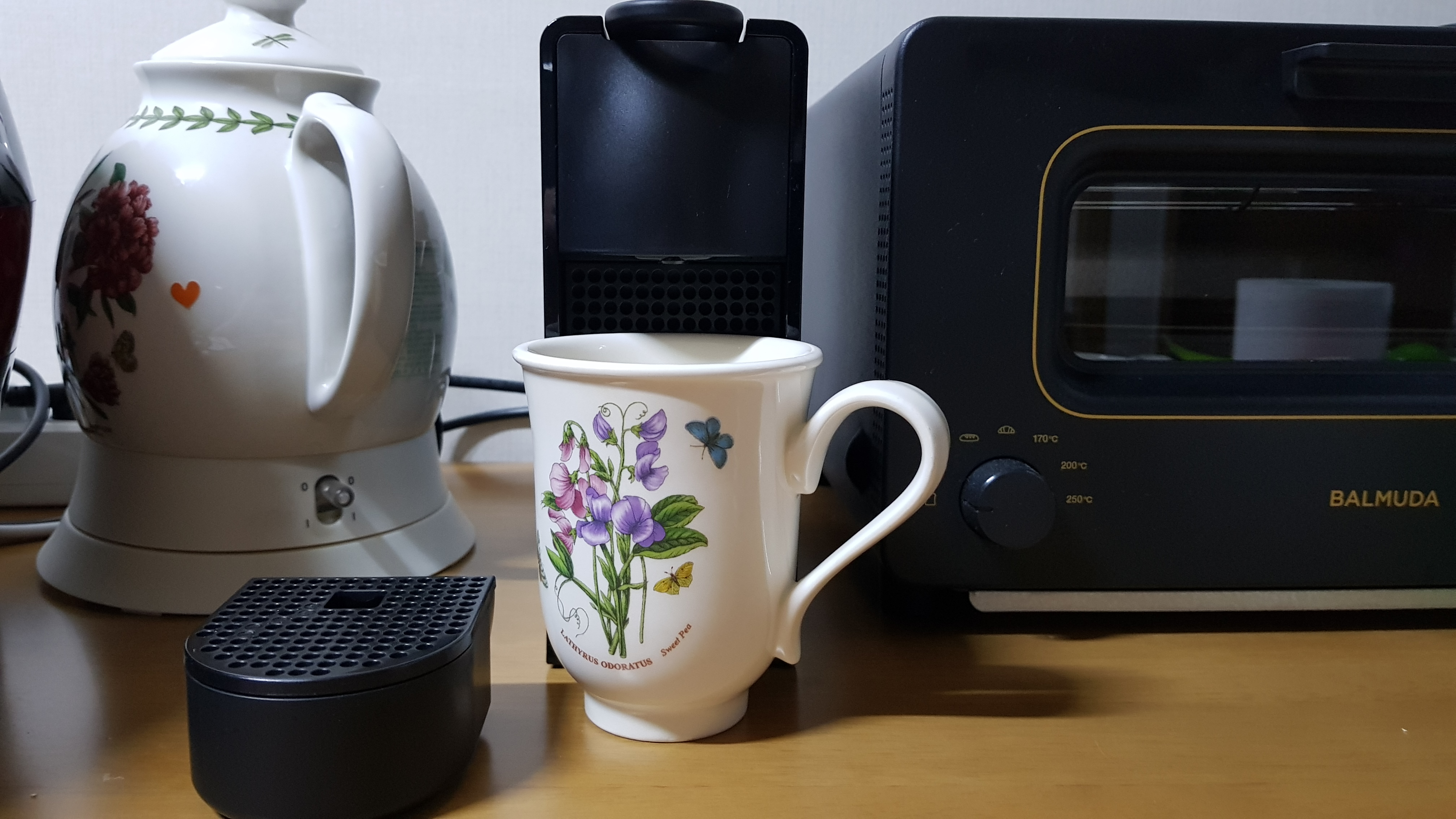 에센자 미니 c30 높이가 낮아서 큰 컵은 커피 추출구에 맞춰서 들어가지가 않는다. 큰컵에 얼음을 넣어서 마시고자 한다면 작은 컵에 받았다가 옮겨 담아야한다. 필자는 바로 마실거라서 작은 찻잔을 준비했다.