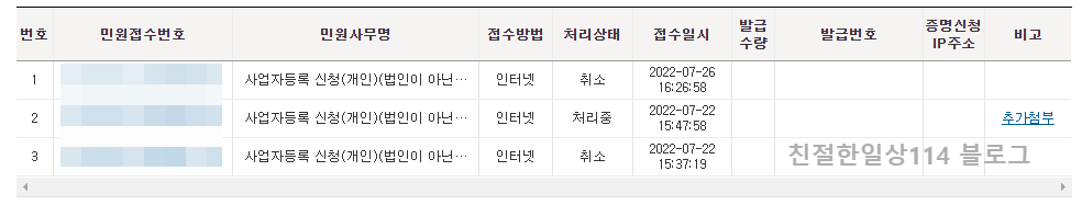 이렇게 3개의 업종코드를 넣고 사업자등록신청을 했으나 서류가 구비되지 않아서 취소해야 했다.
