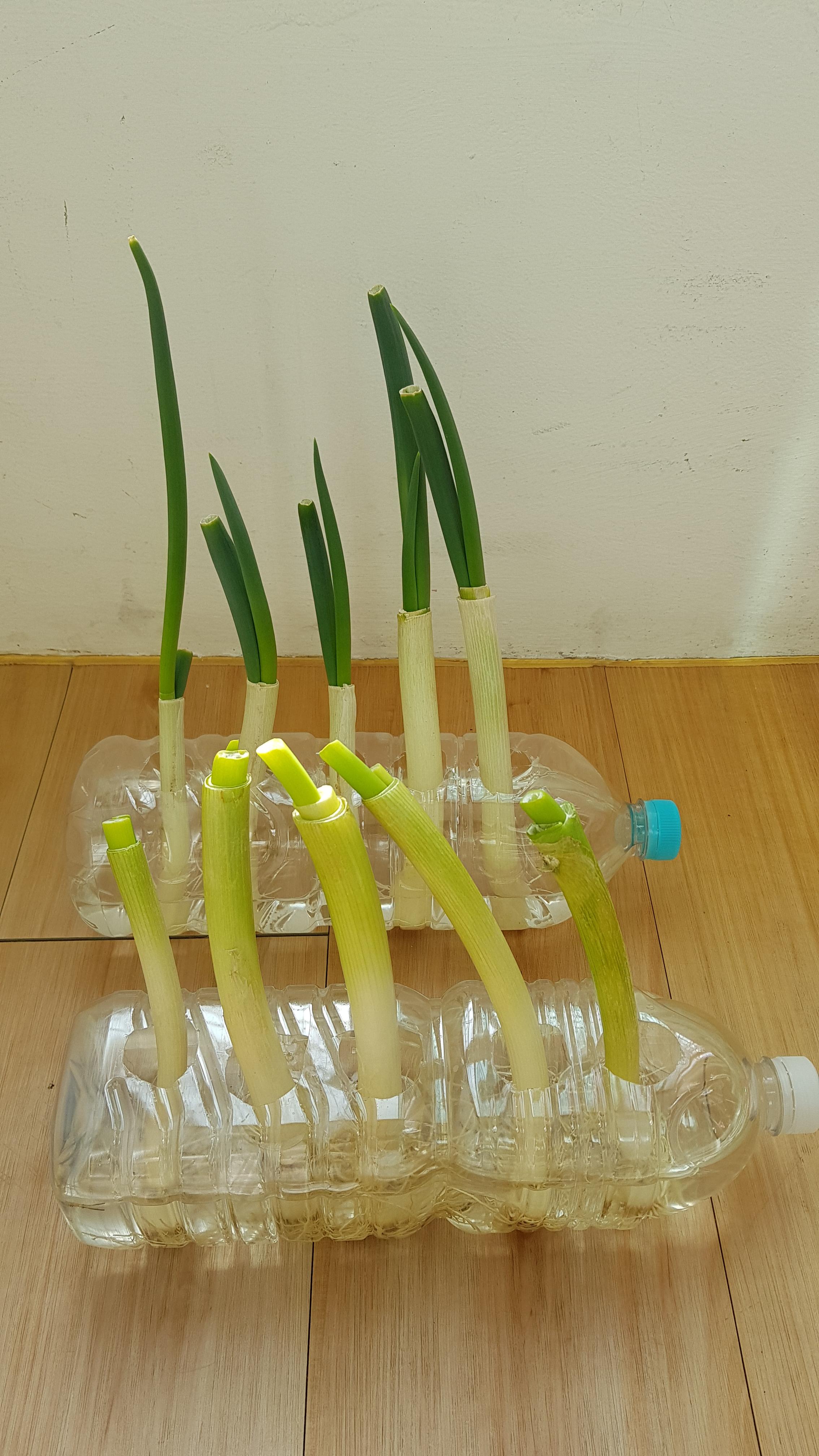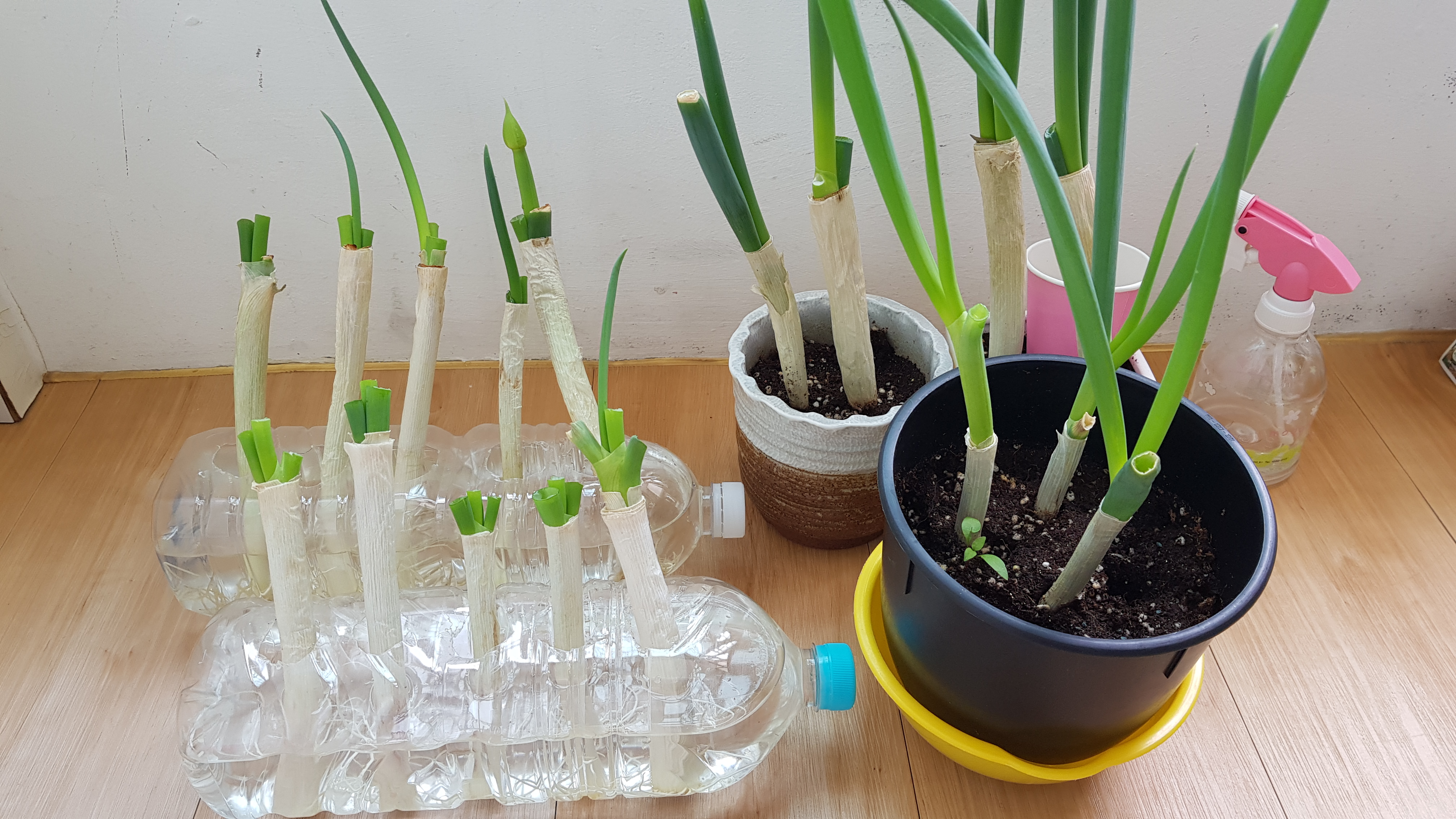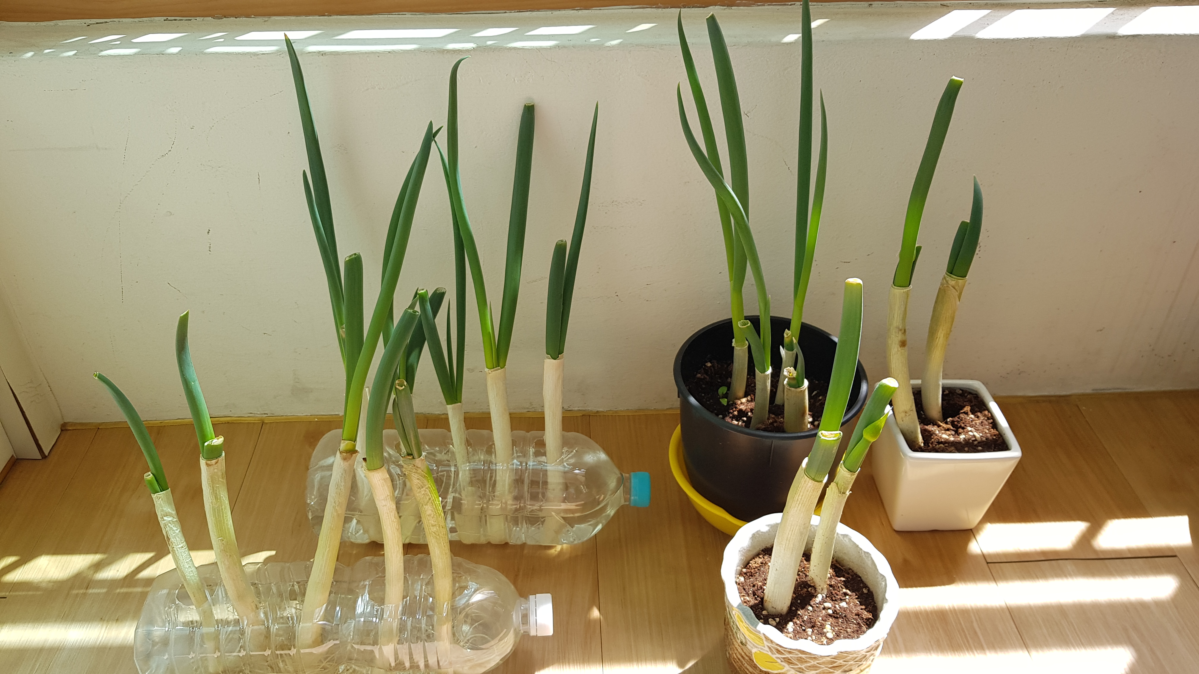 앞쪽에 페트병에 있는 대파가 나중에 심은 파로 2일차에 접어들었고 뒤쪽 페트병에 있는 대파는 먼저 심은 파로 10일차에 접어들었다.