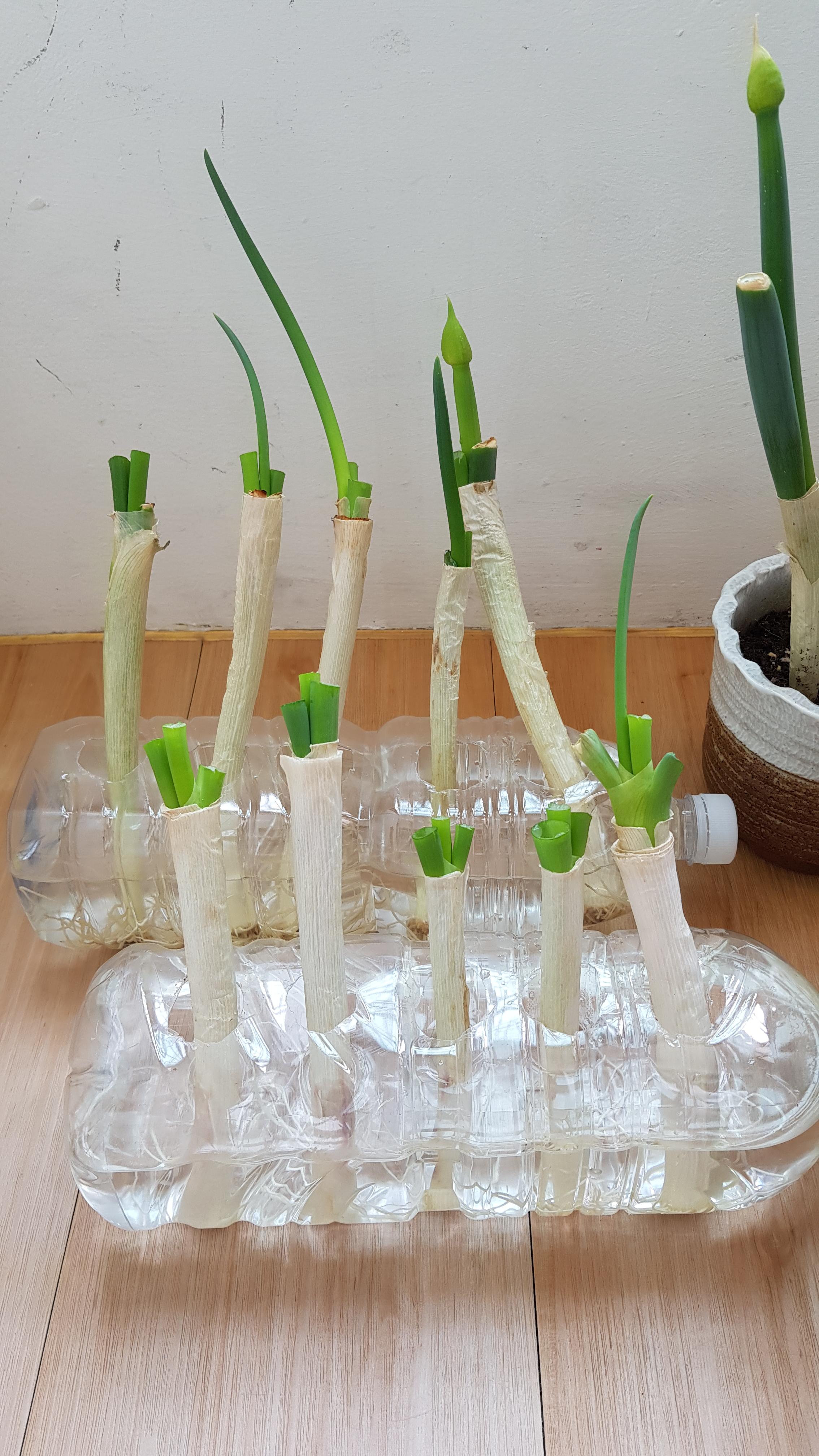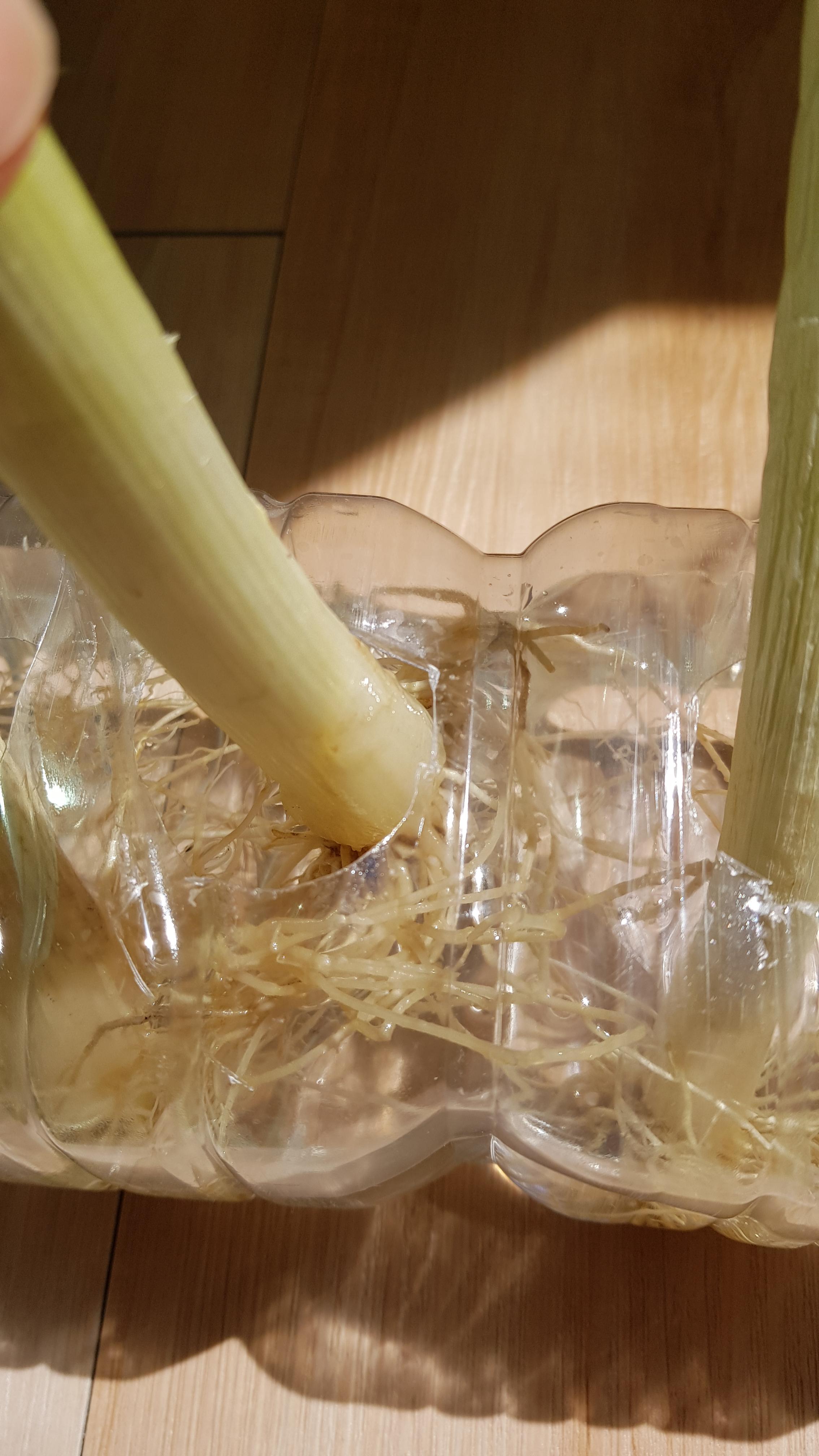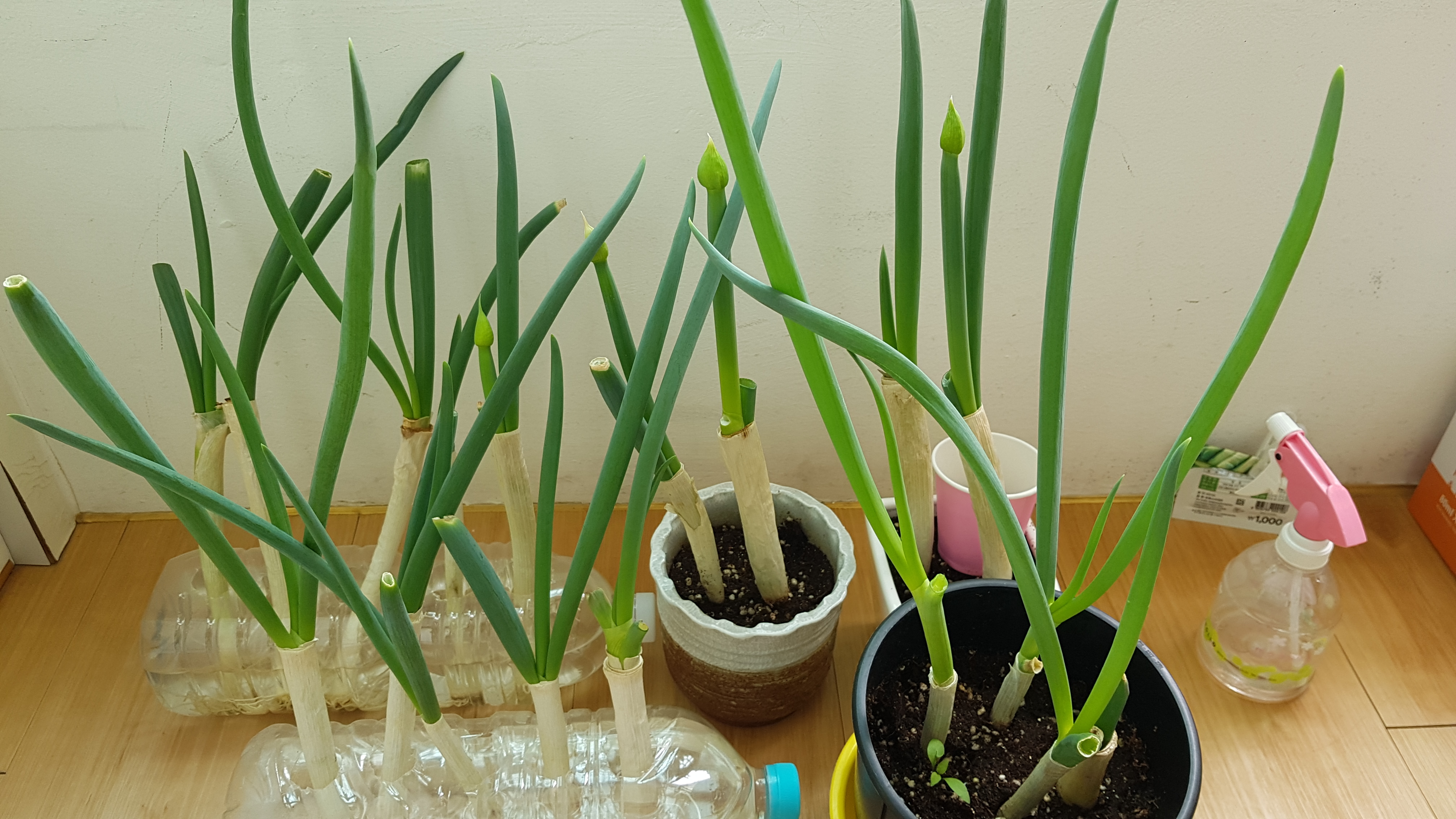 앞쪽에 페트병에 있는 대파가 나중에 심은 파로 2일차에 접어들었고 뒤쪽 페트병에 있는 대파는 먼저 심은 파로 10일차에 접어들었다.